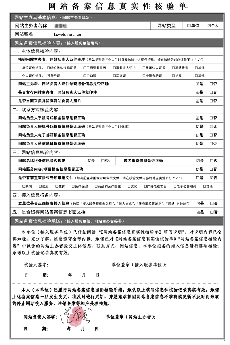 個人網(wǎng)站在天蠶重慶網(wǎng)絡(luò)公司建站后,個人備案填寫的核驗單填寫方法如下范例: