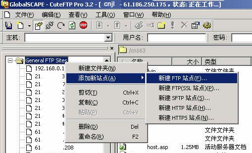 ★使用中國杰聯(lián)網(wǎng)空間,由于服務(wù)器的安全設(shè)置,請最好使用Cuteftp Pro進行上傳,以避免使用其它軟件可能造成的麻煩! ★Cuteftp Pro下載地址: ★請點擊這里:下載Cuteftp Pro漢化注冊版 ★Cuteftp Pro安裝說明: ★下載上述壓縮包后,請使用winrar解壓到本地硬盤某個目錄下。 ★請查看里面的幫助文件,按照說明進行安裝即可。 --==FTP上傳軟件使用==-- ★打開Cuteftp Pro,點擊左邊窗口"站點管理器",右擊"General FTP Sites"(如圖1),在出現(xiàn)的菜單中選擇"添加新站點"-->"新建FTP站點"。