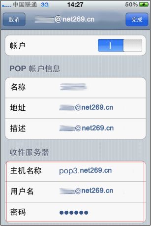 四、收件服務(wù)器中設(shè)置您的郵件服務(wù)器,賬號(hào)和密碼,郵件服務(wù)器您可以填寫“pop3.net269.cn”(也可以填寫pop3.您的域名,視您是否做得高級(jí)解析決定的):