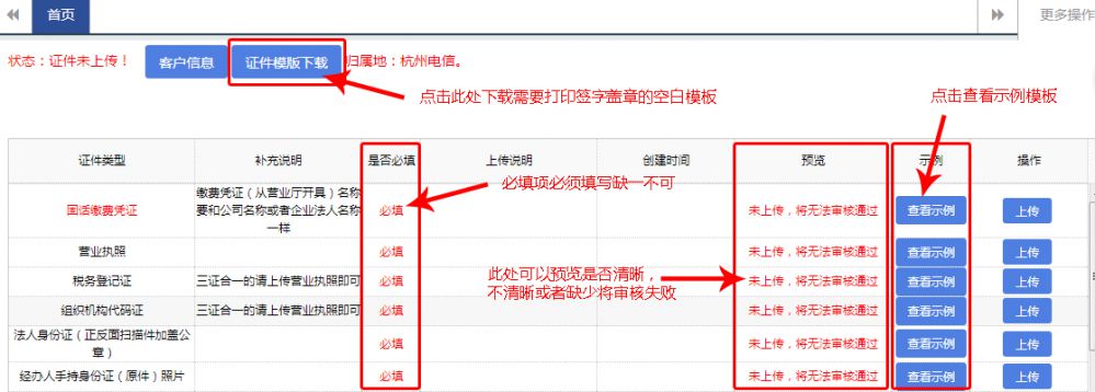 第一步 :登陸平臺 地址:tx.k400.cc 第二步:輸入您的400號碼,輸入你的密碼 登陸完成之后,為保障您企業(yè)信息安全,建議修改密碼。 第三步:按照平臺提示部分進(jìn)行操作,先在下載證件模版,進(jìn)行解壓 按照里面的復(fù)機(jī)要求文件準(zhǔn)備相關(guān)的資質(zhì)文件,如果不清楚具體的規(guī)范,可參照后面的查看示例進(jìn)行比對。平臺上有具體的標(biāo)識。