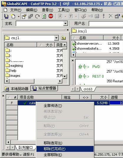 ★你可以點擊最上面的"stop"圖標停止上傳,如果要繼續(xù)上傳,右擊下面?zhèn)鬏旉犃兄械牡奈募?,選擇"全部傳送"或者"傳送選定"即可。也可以選擇"移除選定"或者"全部移除"等菜單刪除傳輸隊列。如圖4。