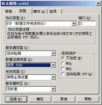 ★本公司一些服務(wù)器因為安全設(shè)置的關(guān)系,必須使用"port"方式登錄才能正常上傳文件,這時,需要您在上面窗口中點擊"類型"選項卡(如圖3),在"數(shù)據(jù)連接類型"下拉框中選擇"使用 PORT",再點擊"確定"就行了。