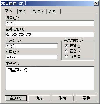 ★在出現(xiàn)的"站點屬性"窗口(如圖2)中,在"常規(guī)"選項卡中,輸入您的FTP相關(guān)資料,其中"登錄方式"中選擇"標準"。再點擊"確定"就行了。
